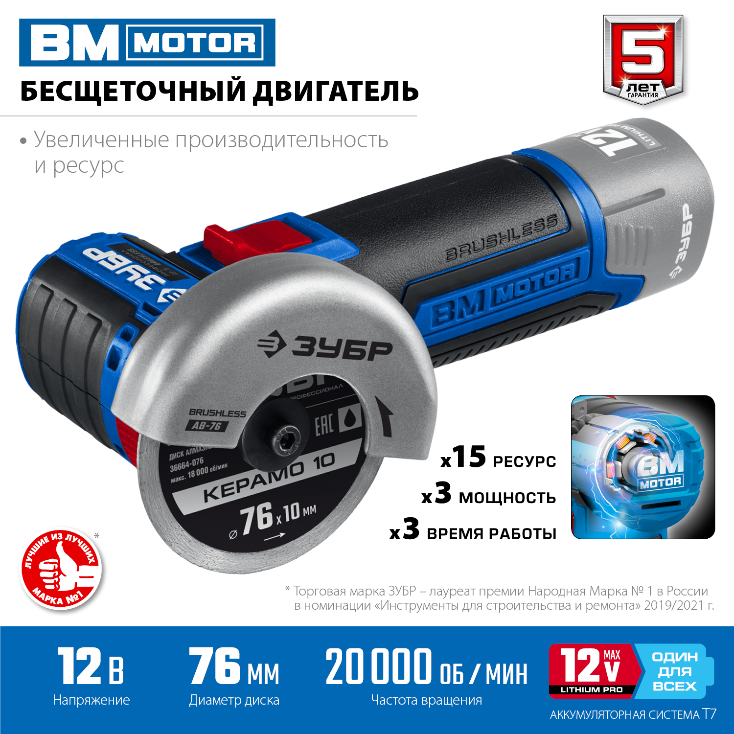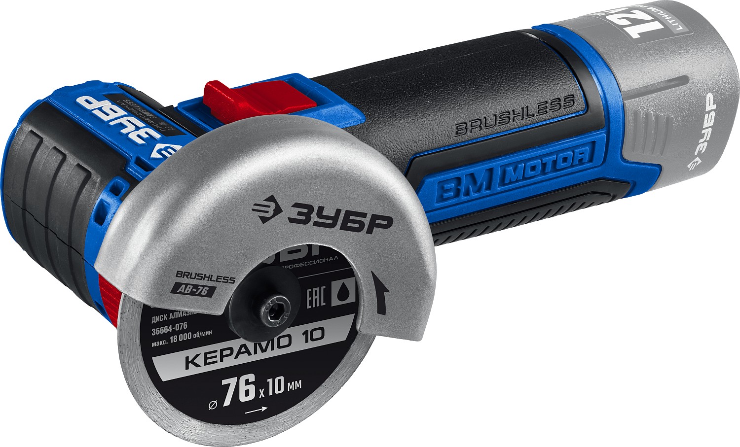 УШМ бесщеточная ЗУБР Т7, 12 В, d76 мм, без АКБ, Профессионал (AB-76)