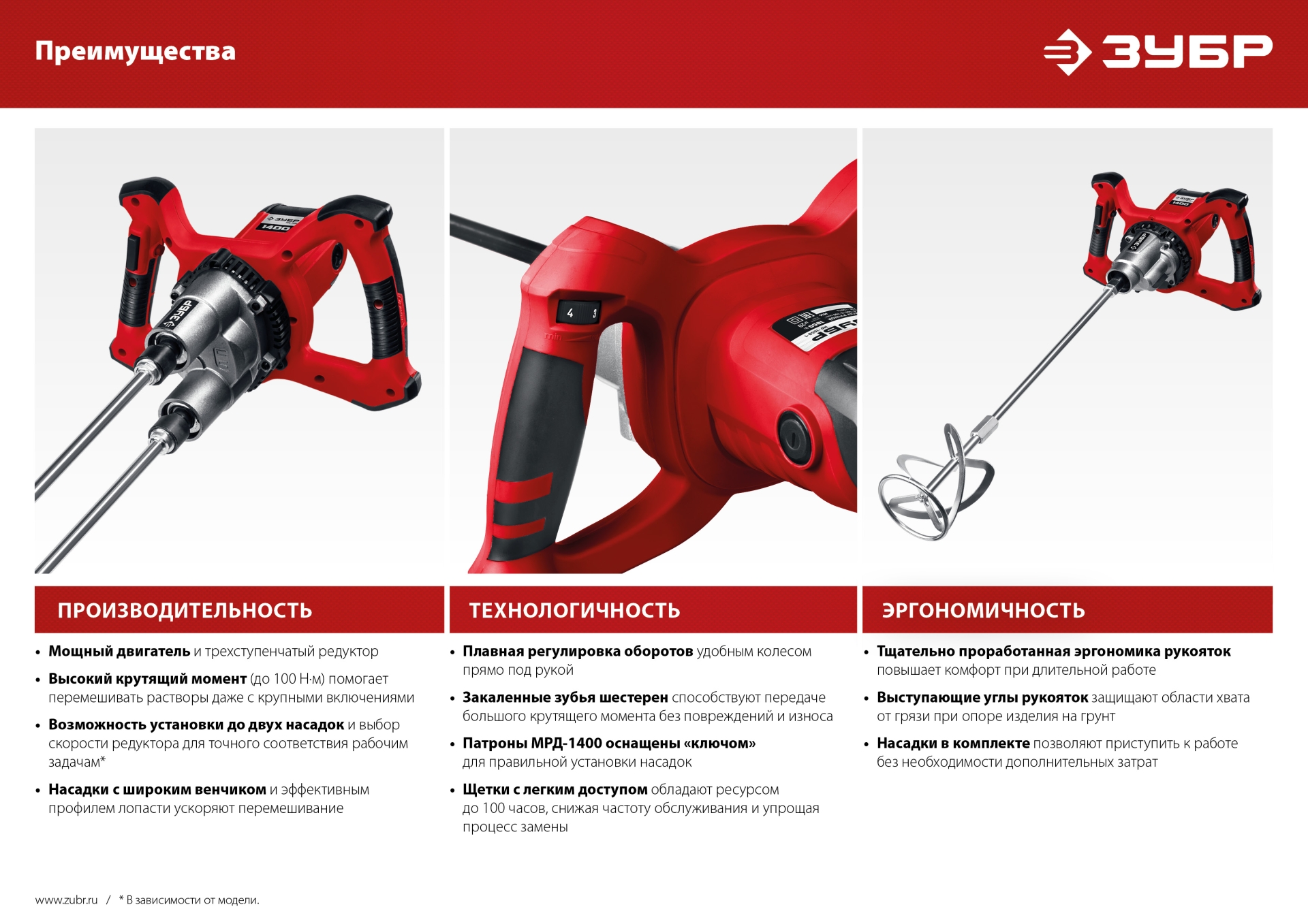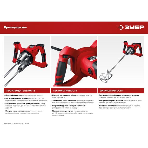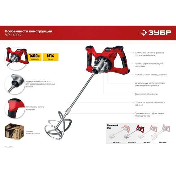 Миксер строительный 1400 Вт, М14, 2 скорости, Зубр (МР-1400-2)